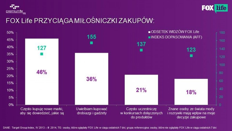 Kanał FOX Life przyciąga przed telewizory bardzo atrakcyjna widownię kobiecą. Z badań TGI wynika, że kobiety oglądające FOX Life to trendsetterki z apetytem na życie, kochające robić zakupy.