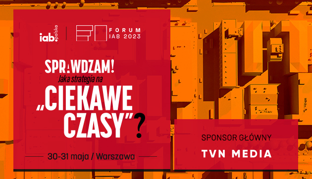W dniach 30-31 maja 2023 odbywa się szesnasta edycja Forum IAB. Biuro Reklamy TVN Media, po raz kolejny z pełnym zaangażowaniem, wspiera tę inicjatywę w roli Sponsora Głównego wydarzenia. Forum IAB to coroczne święto branży marketingu i digital, podczas którego przez dwa intensywne dni blisko 100 wybitnych ekspertów prezentuje najnowocześniejsze trendy i rozwiązania. W tym roku konferencja odbywa się w pełni stacjonarnie w Multikinie Złote Tarasy w Warszawie pod hasłem "2023 mówi: "Sprawdzam! Jaka strategia na «ciekawe czasy»".