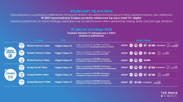 W 2025 TVN Media wprowadza do oferty reklamowej kolejne produkty, które łączą siłę reklamy video w telewizji i online. Nowe pakiety zostały zaprojektowane, aby maksymalizować zasięg jakościowego video i zaangażowanie odbiorców na różnych platformach.