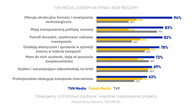 W tym roku we wszystkich badanych obszarach Biuro Reklamy TVN Media jest liderem i we wszystkich z wynikiem powyżej średniej dla kategorii: