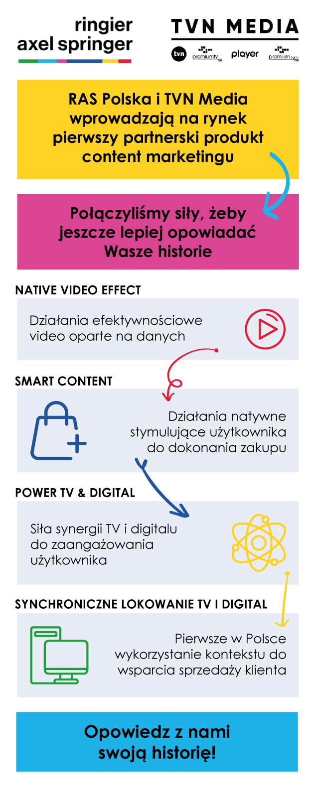 Nowa, partnerska oferta content marketingowa TVN Grupa Discovery oraz Ringier Axel Springer Polska obejmuje cztery główne produkty: rozwiązania natywne video o charakterze efektywnościowym, budujące świadomość w oparciu o rozwiązania contentowe, wspierające sprzedaż z szerokim zasięgiem telewizyjno-digitalowym, a także absolutną nowość na rynku - produkt synchronicznego lokowania w TV&Digital. Ostatni z produktów umożliwia opowiedzenie historii marki jednocześnie w telewizji, w programie „Dzień Dobry TVN” oraz w środowisku Digital w formacie „Onet w domu”. Rozwiązanie dodatkowo wsparte jest mechanizmem Shoppable TV, działającym prosprzedażowo.