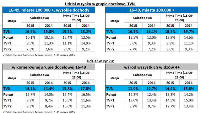 Udziały TVN na tle wyników konkurencji w poszczególnych grupach docelowych w marcu 2015 roku prezentują poniższe tabele:
