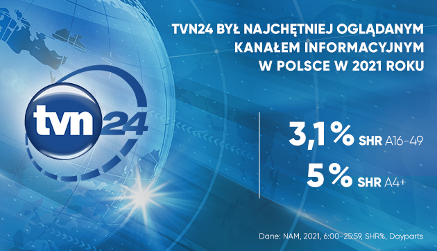 TVN24 był najchętniej oglądanym kanałem informacyjnym w Polsce w 2021 roku. Średnio w ciągu roku stacja osiągnęła udział na poziomie 3,1% SHR w grupie A16-49 (kolejnymi stacjami pod względem wysokości udziałów były TVP Info 1,7 % i Polsat News 1,5 %). W grupie 4+ wynik TVN24 to aż 5% SHR (TVP Info 4 %, Polsat News 1,8 %). Jest to drugi najlepszy udział w historii TVN24.