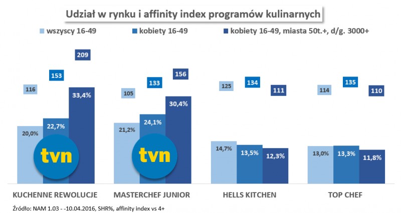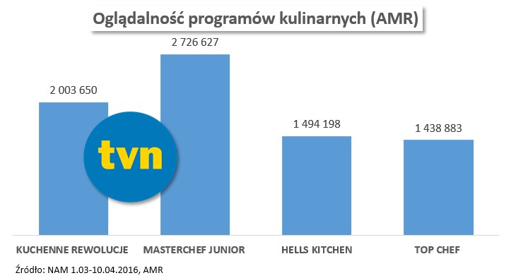 W każdy czwartek rewolucje Magdy Gessler śledzi średnio ponad 2 mln widzów, a wśród nich znajduje się co trzecia kobieta z większego miasta z ponadprzeciętnymi dochodami. Jeszcze lepsze wyniki osiąga „Masterchef Junior”, który co niedziela przyciąga przed ekrany ponad 2,7 mln widzów.
