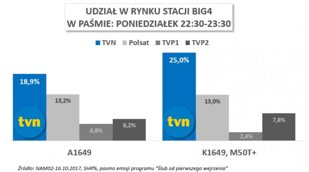 „Ślub od pierwszego wejrzenia”, budzący na całym świecie skrajne emocje miłosny eksperyment, co tydzień przyciąga coraz większą liczbę widzów. W tym tygodniu losy 3 par, które zdecydowały powiedzieć sobie „TAK” przed urzędnikiem Stanu Cywilnego, śledziło już 1,5 mln osób. Show przyciągnęło przed odbiorniki aż 25% kobiet zasiadających w tym czasie przed odbiornikami TV. Udział w rynku w paśmie programu w grupach kobiecych był wyższy niż suma udziałów wszystkich trzech pozostałych stacji z BIG4!