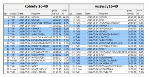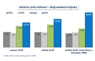 Podczas pierwszych wolnych dni maja widzowie z komercyjnej grupy docelowej (16 - 49) najchętniej oglądali programy w TVN. W dniach 1 - 4 maja 2014 r. udział stacji TVN w rynku wyniósł 13,1%. W grupie zamożnych kobiet z większych miast TVN przyciągnął przed ekrany niemal dwukrotnie większą widownię niż pozostałe największe stacje telewizyjne.