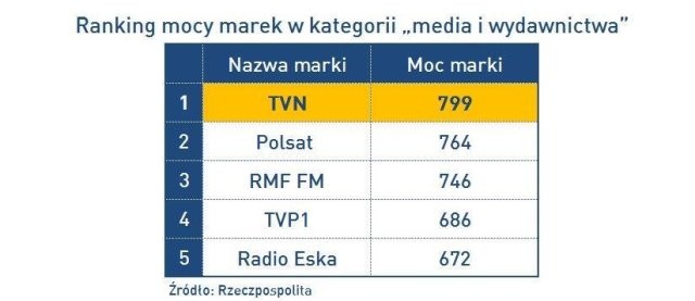 TVN jest najmocniejszą marką medialną w Polsce – wynika z jubileuszowej, dziesiątej edycji Rankingu Polskich Marek, który publikuje dziennik „Rzeczpospolita".