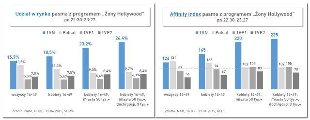 Szczególną popularnością „Żony Hollywood” cieszą się wśród zamożnych kobiet z większych miast, gdzie udział w rynku w paśmie nadawania programu jest wyższy niż łączny udział w widowni TVP1, TVP2 i Polsatu. Dla reklamodawców posiadających w swoim portfolio produkty skierowane do kobiet program wykazuje olbrzymią efektywność kosztową, ze względu na index dopasowania, który w przypadku miejskich kobiet przekracza poziom 200.