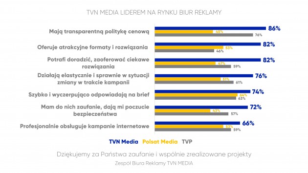 W tym roku we wszystkich badanych obszarach Biuro Reklamy TVN Media jest liderem i we wszystkich z wynikiem powyżej średniej dla kategorii: