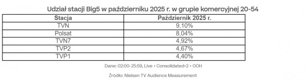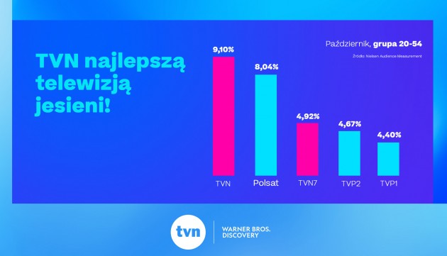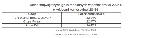 W październiku 2025 r. grupa TVN Warner Bros. Discovery utrzymała pozycję lidera, osiągając udział na poziomie ponad 22,9% w grupie komercyjnej.