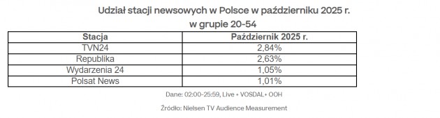 Wyniki z minionego miesiąca potwierdzają niekwestionowaną dominację stacji newsowych TVN Warner Bros. Discovery. W październiku 2025 roku „Fakty” utrzymały pozycję lidera wśród serwisów informacyjnych w obu grupach docelowych. Na obu kanałach, na których emitowano program – TVN i TVN24 BiS – łączny udział osiągnął poziom blisko 20,2% w widowni komercyjnej oraz prawie 20,1% w grupie wszystkich widzów. W październiku 2025 r. TVN24 utrzymał pozycję lidera w widowni komercyjnej, notując udział na poziomie ponad 2,8%. W grupie wszystkich widzów kanał osiągnął udział na poziomie ponad 4,5%.