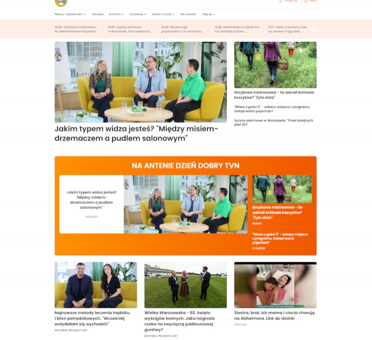 Serwis Dzień Dobry intensywnie się rozwija, wciąż zaskakując nowymi tematami, rozmowami i poradami. Użytkownicy serwisu codziennie mają dostęp do kilkudziesięciu nowych artykułów i materiałów video. Oprócz materiałów redakcyjnych, w serwisie publikowane są także treści content marketingowe, opracowywane przez redakcję serwisu zgodnie z potrzebami klientów i sponsorów.