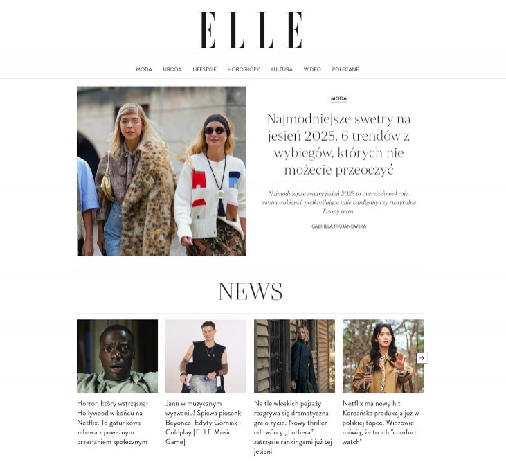 ELLE - kultowa, światowa marka o modzie. ELLE.pl to przestrzeń dla współczesnej kobiety, dla której, jeśli czas ma znaczenie, to jedynie w kontekście spędzania go w świetnym stylu i ciekawości, co przyniesie przyszłość. Redakcja codziennie tworzy newsowe treści w tematyce mody, urody, trendów, kultury i stylu życia dla 3,5 miliona użytkowniczek odwiedzających serwis miesięcznie.