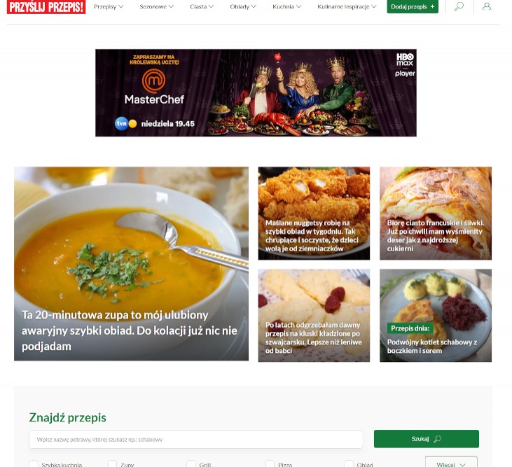 PRZYŚLIJ PRZEPIS to marka o ugruntowanej, niezwykle silnej pozycji w świecie polskich kulinariów. A Przyślijprzepis.pl jest serwisem, który dzięki ogromnej bazie przepisów, jak serdeczna sąsiadka pomaga zorganizować życie rodzinne, ułatwiając wyszukiwanie potraw, jakich składniki bez problemu można znaleźć w każdym sklepie. To miejsce, gdzie użytkownicy dzielą się największymi sekretami swojej kuchni – tworzą profile z autorskimi przepisami, komponując imponujących rozmiarów książki kucharskie. Ten serwis to platforma do wymiany porad, trików i komentarzy dotyczących codziennego gotowania. Jeśli można przygotowywać potrawy prościej, to ten sposób z pewnością użytkownik znajdzie na przyslijprzepis.pl!