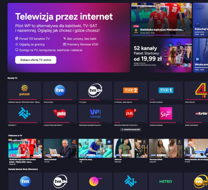 WP Pilot to nowoczesne centrum telewizyjne, które redefiniuje sposób, w jaki widzowie konsumują treści. Jako część oferty TVN Warner Bros. Discovery, WP Pilot łączy tradycyjną telewizję z cyfrową wygodą, oferując dostęp do ponad 100 kanałów - od ogólnotematycznych, przez informacyjne, filmowe, sportowe, po dziecięce - dostępnych na żywo, w dowolnym miejscu i czasie. Serwis działa w modelu darmowym (z reklamami) oraz abonamentowym, oferując pakiety premium z dodatkowymi funkcjami, takimi jak CatchUp, dostęp na wielu urządzeniach czy biblioteka VOD. WP Pilot jako pierwszy operator zewnętrzny w Polsce wdrożył technologię DAI (dynamicznej podmiany reklam) na kanałach TVN, co otwiera nowe możliwości dla reklamodawców w środowisku OTT/TV Everywhere. Platforma dostępna jest na wszystkich ekranach - od smartfonów po telewizory - i stanowi kluczowy element strategii Total Premium Video, łącząc zasięg, jakość i precyzję komunikacji. To więcej niż telewizja - to cyfrowe doświadczenie, które angażuje, dociera i inspiruje.