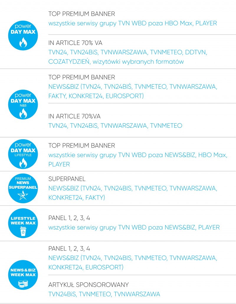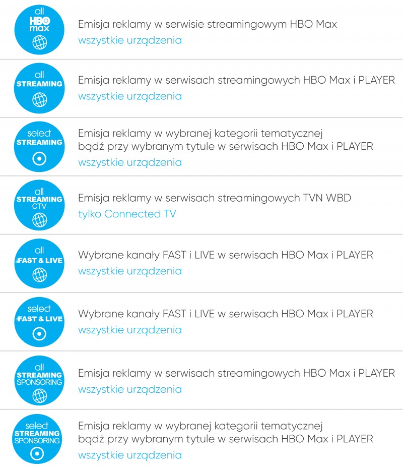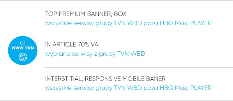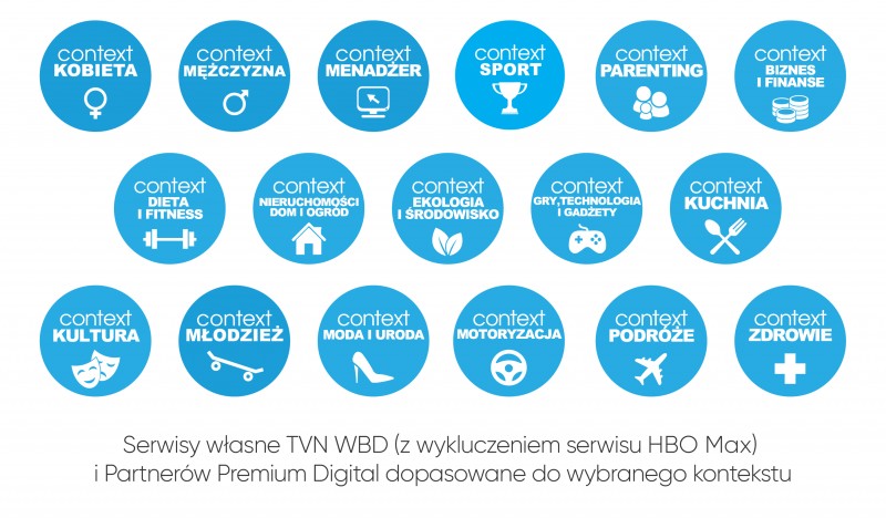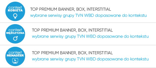 Reklamy wyświetlane w ramach produktów Context są emitowane w serwisach grupy TVN Warner Bros. Discovery (z wyłączeniem serwisu HBO Max) i Partnerów Premium Digital dopasowanych do wybranego kontekstu.