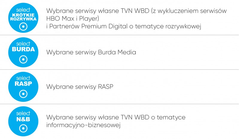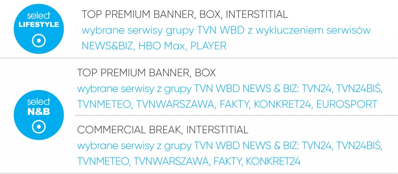 Emisja reklamy w modelu select oferuje dostęp do produktów dających możliwości precyzyjnego określenia przez reklamodawcę zarówno treści, jak i miejsca wyświetlenia reklamy w serwisach z oferty TVN Warner Bros. Discovery i Partnerów Premium Digital. Jest to wariant idealny do wzmacniania wizerunku i świadomości marki wśród odbiorców treści z kategorii lifestyle oraz news & business.