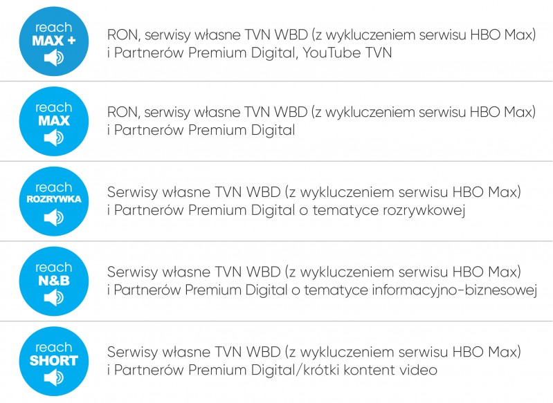 Emisja reklamy w modelu Reach daje dostęp do grupy produktów zasięgowych oferujących najszersze dotarcie do użytkowników konsumujących treści wideo dostępne w serwisach TVN Warner Bros. Discovery i Partnerów Premium Digital. Produkty w modelu Reach oferują perspektywę efektywnego budowania świadomości marki i umożliwiają realizację działań sprzedażowych, w zależności od dostępnego budżetu, charakterystyki produktu i grupy docelowej.