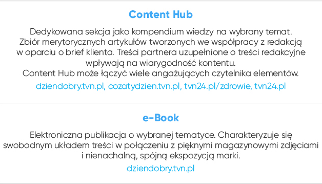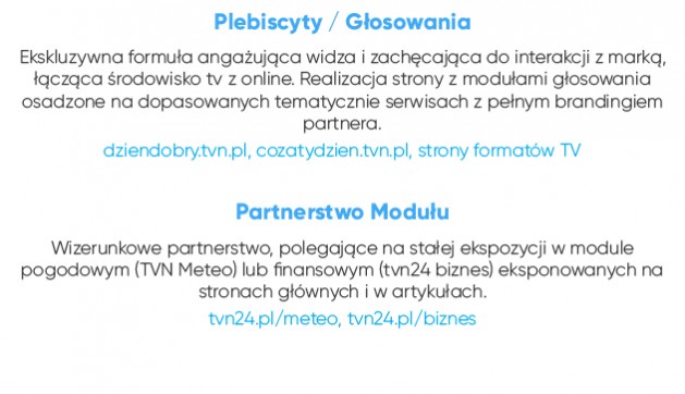 Budujemy szeroki zasięg komunikacji w oparciu o najlepszy na rynku jakościowy kontent pochodzący z platform TVN  Warner Bros. Discovery, od partnerów krajowych i zagranicznych oraz od największych koncernów mediowych.